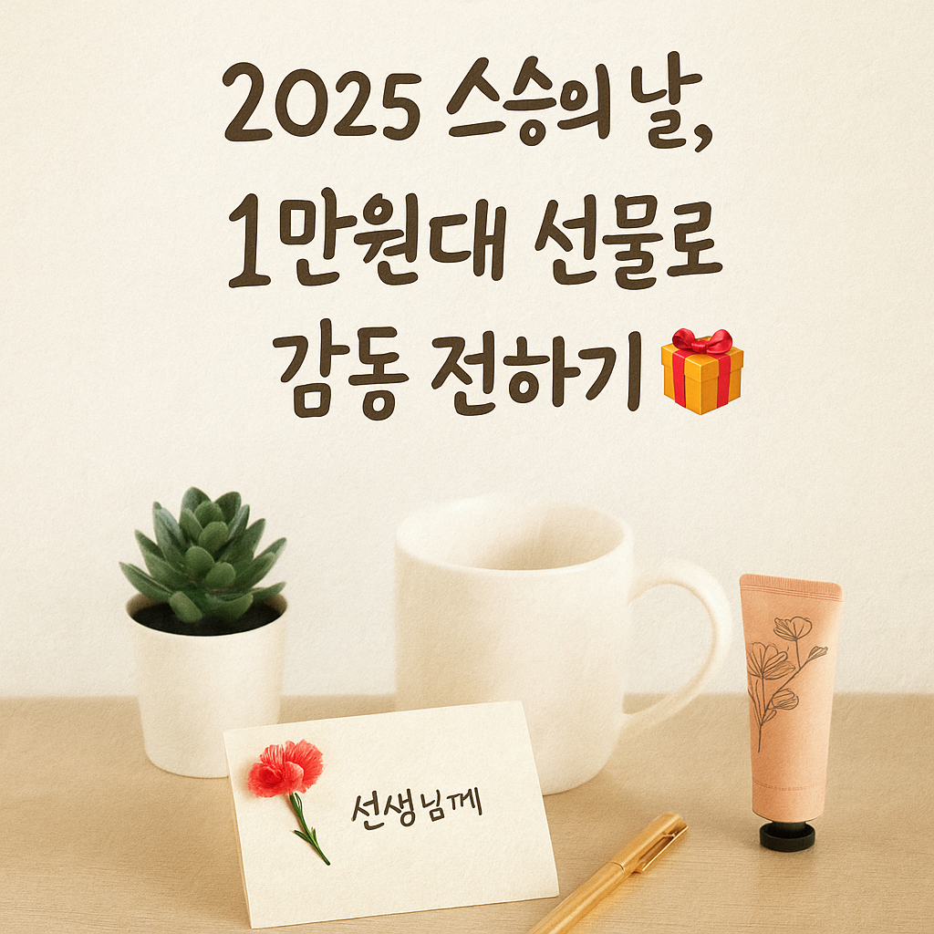 스승의 날, 1만원대 예산으로 준비할 수 있는 실용적이고 감동적인 선물 아이디어를 소개합니다. 이름 각인 볼펜, 맞춤 머그컵, 미니 화분, 수제 디저트 등 선생님의 취향과 상황에 맞는 선물을 추천합니다. 청탁금지법도 고려한 실속 있는 선물 리스트를 확인해보세요.